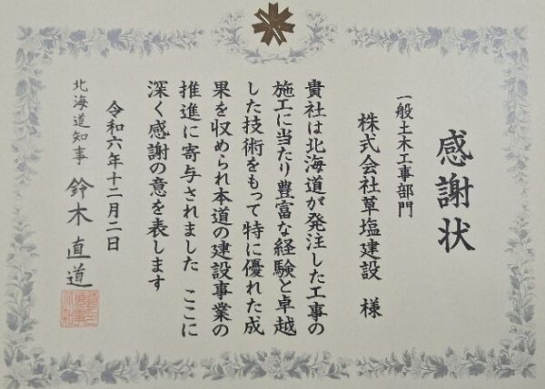 12月11日、胆振総合振興局にて、「2024年度北海道建設部工事等優秀者表彰伝達式」が執り行われ、北海道より感謝状を頂きました。また、昨年度工事における優秀技術者表彰が行われ、胆振日高管内より8名の技術者が選ばれ、うち当 […]