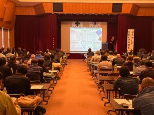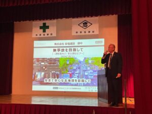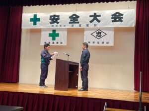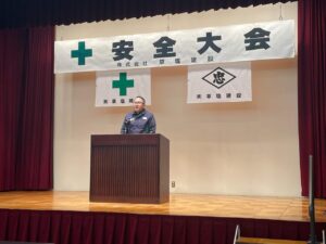 10月11日金曜日、登別市民会館において「工事追込み期」を迎えるにあたり、当社の安全衛生大会を開催しました。当日は当社職員及び協力会社120名が集い、室蘭労働基準監督署より伊原秀明署長様が「いぶりの地から安全宣言、みんなで守ろう快適職場」と題して、続いてMS&ADインターリスク総研株式会社(三井住友グループ)RM2交通安全サポートグループ札幌オフィスの小 原 隼 人よりそれぞれ安全講話を賜り、最後に土木部、我妻 悟から「安全宣言」が力強く読み上げられ、全員で今年度の無事故無災害を誓いました。