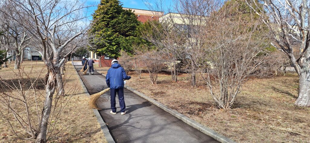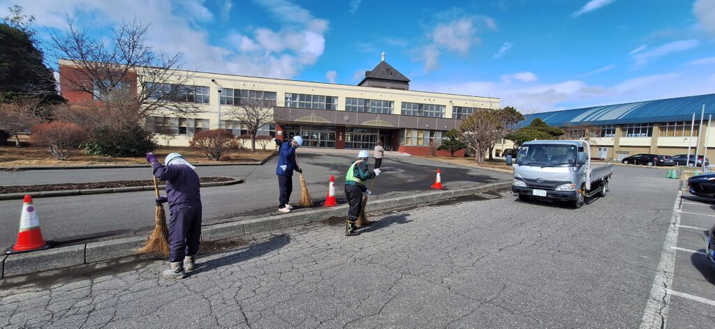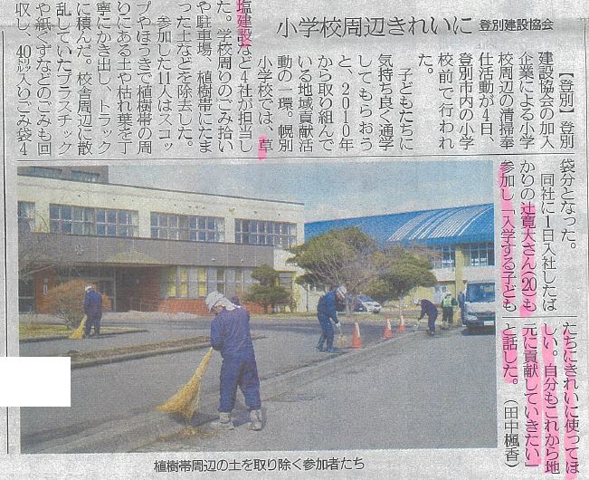 4月4日、毎年登別建設協会に加盟する会社が市内8小学校で実施している入学式前の校舎屋外施設の清掃奉仕に当社職員3名、㈱カナザワ 常盤建設㈱、㈱和田工務店さんの合計11名で幌別小学校のエントランス、駐車場、校庭、グランド施設の清掃を実施しました。今年も綺麗な学校で新一年生を迎えらると思います。