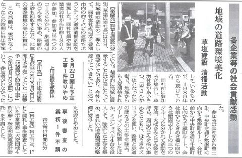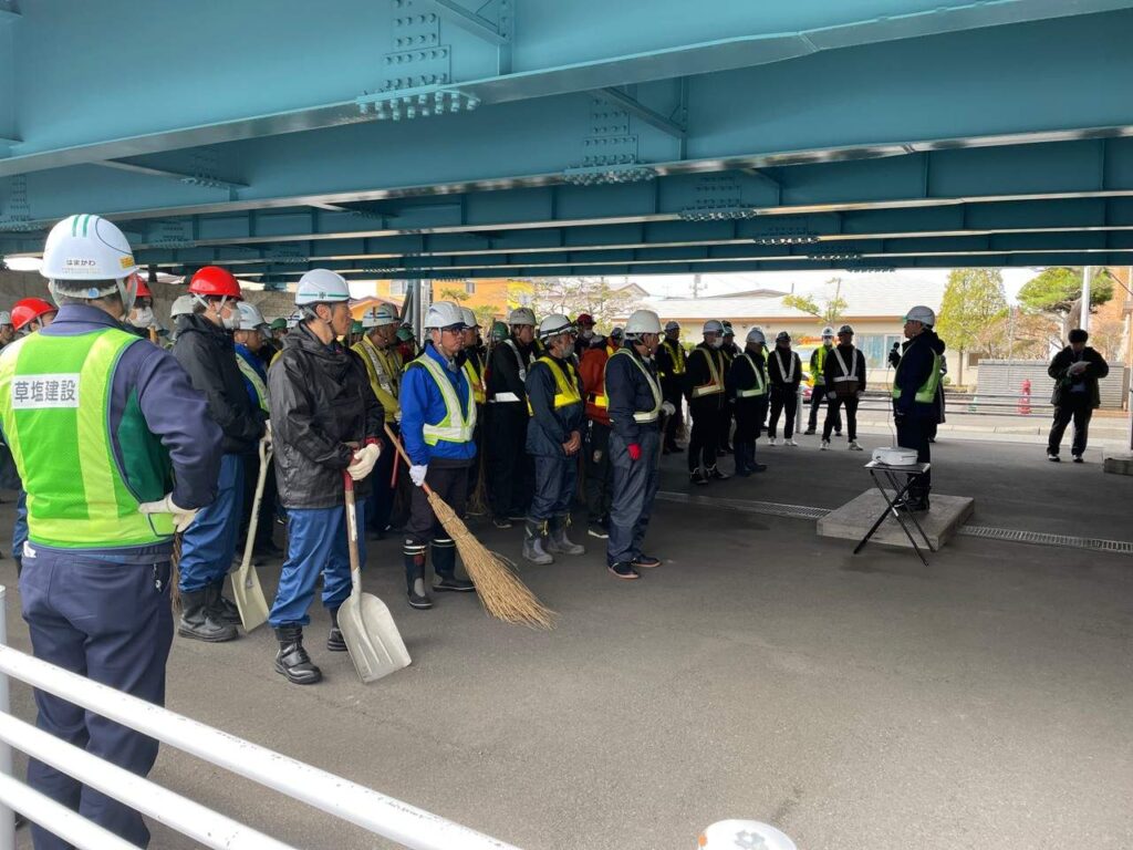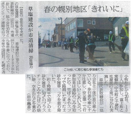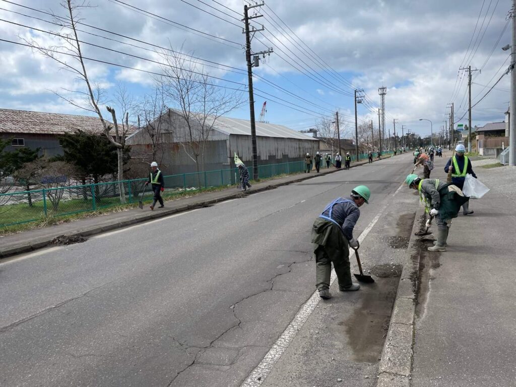 4月21日、当社職員および道内各地から協力会社総勢130名が集い、恒例のボランティア清掃を行いました。この活動は1989年より、毎年雪解けのこの時期に、市道総延長7キロを3班体制でダンプトラック、タイヤショベル各4台、人力を駆使し、沿道に散乱したゴミ回収とスコップでの土砂除去、仕上げに竹ぼうきを使い、快適な道路環境を目指しております。今回は沿道に堆積した砂交じりの土砂約10トン、ごみ50キロ程を回収しました。