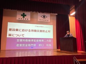 6月5日木曜日、登別市民会館において工事繁忙期を迎えるにあたり、当社職員及び協力会社130名が集い、安全大会を実施しました。今回は室蘭労働基準監督署より産業安全専門官の野口様が「建設業における労働災害防止について」と題して、続いて株式会社仙台銘板営業本部北海道ブロック苫小牧営業所長の江口様と大正製薬東日本営業部第3ブロック食系第1エリア主任の中谷様が「現場の熱中症対策最前線~厳しい夏を乗り越える工夫」と題して、本年6月より改正された「労働安全衛生規則」における留意点、対策についてクイズを交えながら講義をされました。最後に土木部、辻 寛大から「安全宣言」が力強く読み上げられ、全員で今年度の無事故無災害を誓いました。