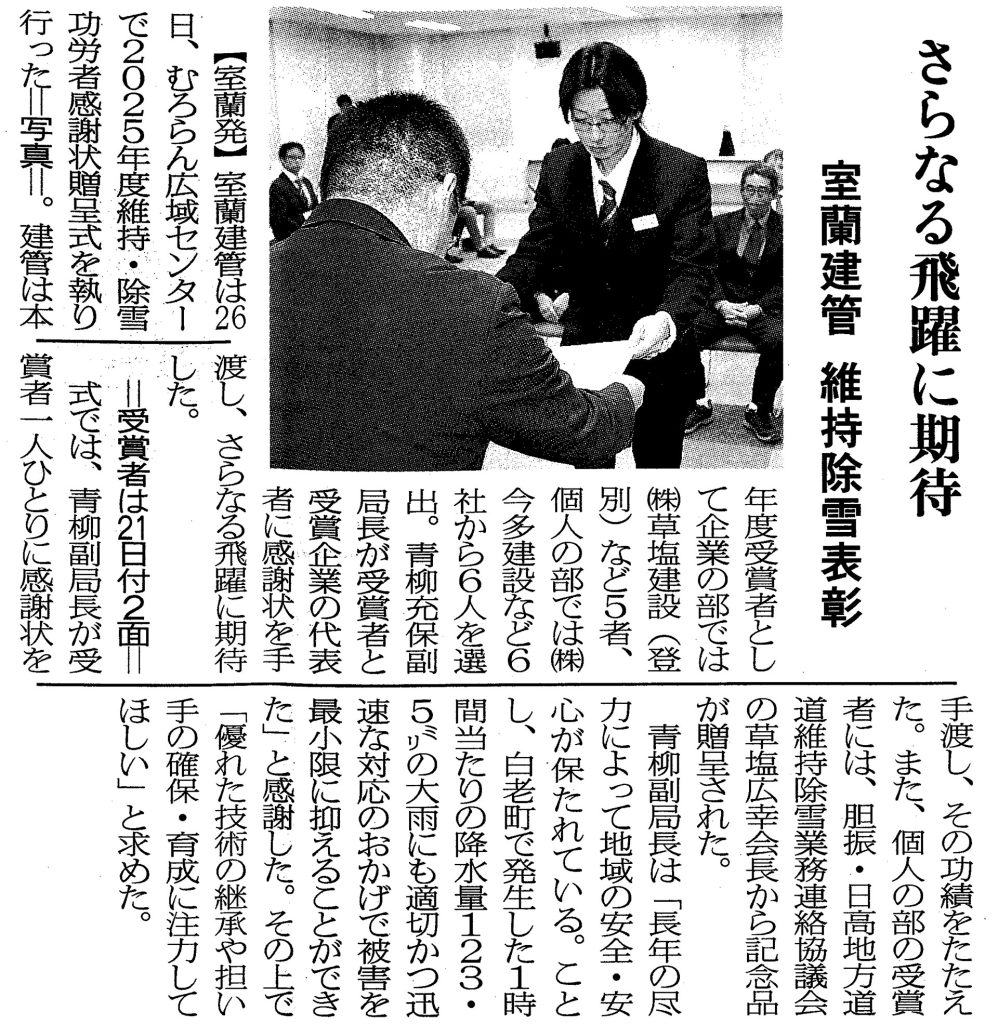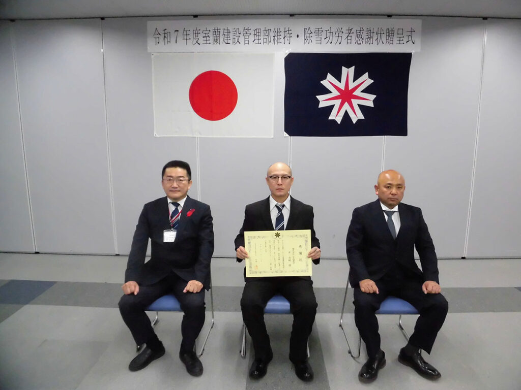 室蘭建設管理部より2025年度維持・除雪功労者感謝状贈呈式で感謝状を頂きました。 2025年11月26日 最終更新日時 : 2026年1月27日 kusashio-kanri 11月26日、胆振振興局にて、「2025年度維持・除雪功労者感謝状贈呈式」が執り行われ、室蘭建設管理部より感謝状を頂きました。また個人の部では6人が選出され、うち当社土木部の平浩嗣が受賞しました。」