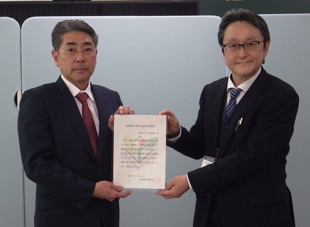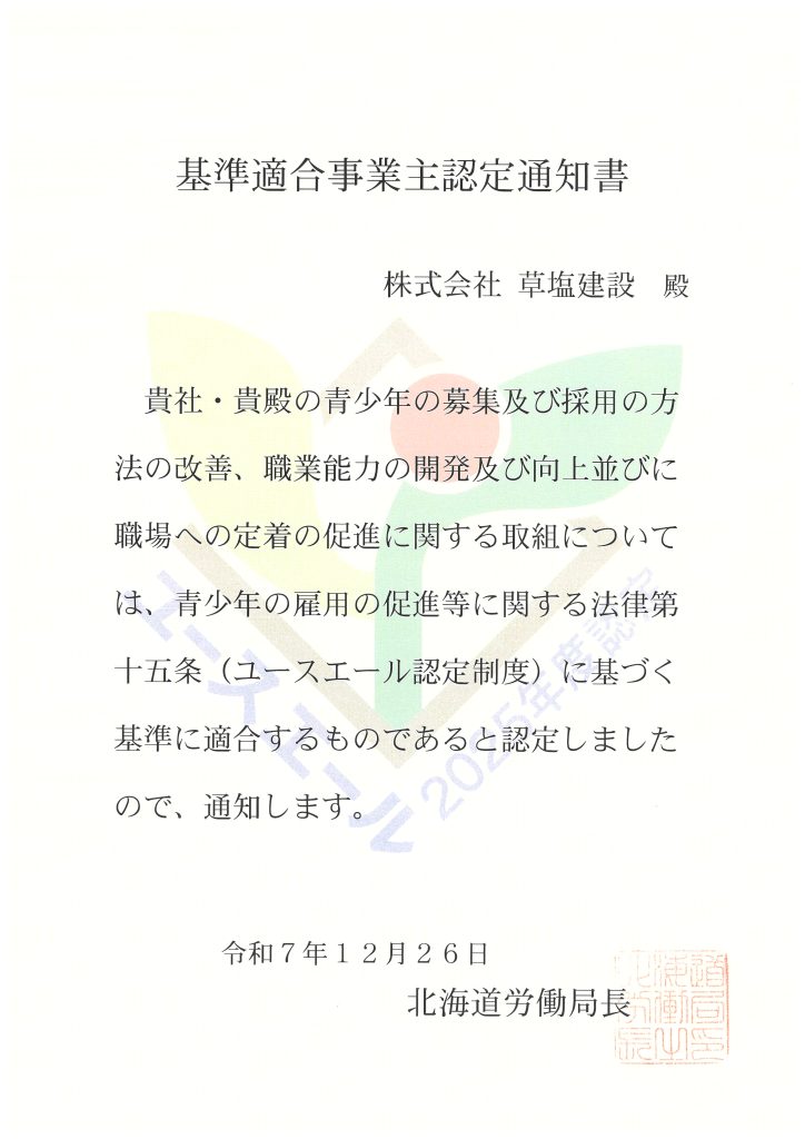 ユースエール認定を取得しました。 2025年12月26日 最終更新日時 : 2026年3月5日 kusashio-kanri Exif_JPEG_PICTURE 2025/12/26 草塩建設の若手職員育成への取り組みが評価され、ユースエール認定の通知書が交付されました。 ユースエールは、若者の雇用育成に関して一定の基準を満たした 優良な中小企業を厚生労働大臣が認定する制度です。