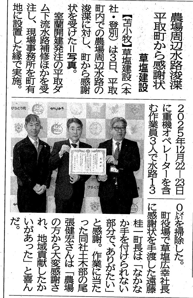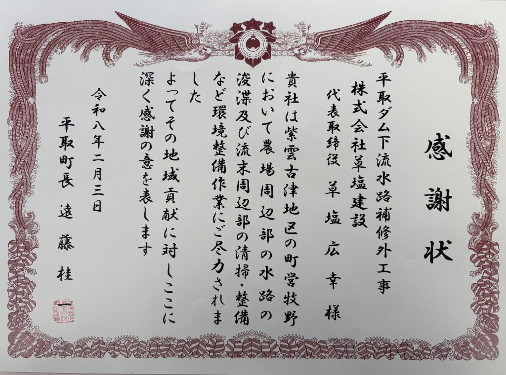 農場周辺水路の浚渫に際して感謝状を頂きました。