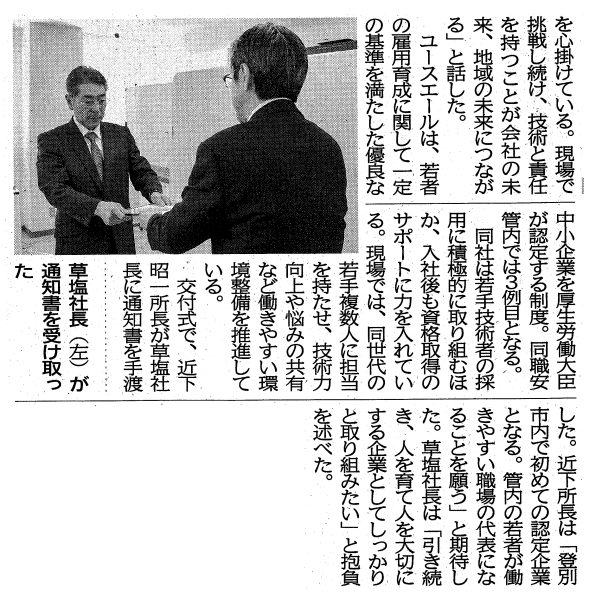 本社の草塩広幸代表取締役社長が感謝状を賜りました。